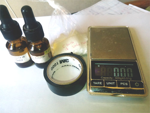 En la figura se ve que 19.6 gramos de clorito, pesan aproximadamente el peso de una cinta aislante 3M, de 3 metros, una cinta pequeña, como referencia para quien no tenga como pesar la cantidad indicada es que puse la imagen de una cinta.