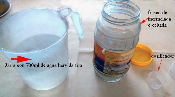 - 700ml de agua(el frasco hasta casi arriba), a falta de un frasco mejor recurrimos a lo que tengamos